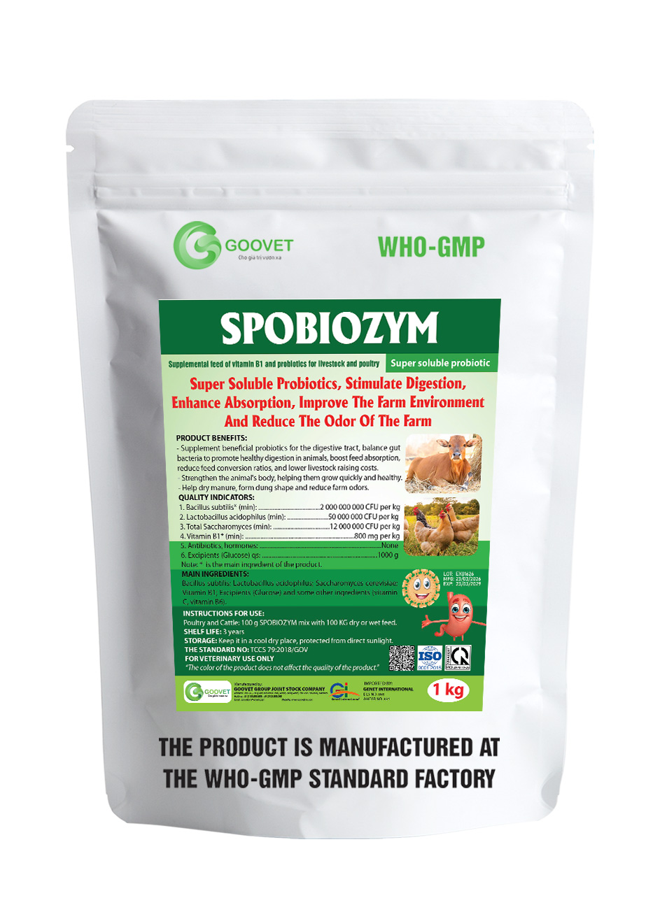 Poultry and Cattle: 100g SPOBIOZYM mix with 100 KG dry or wet feed.
