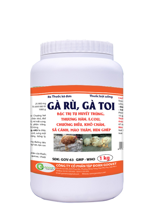 Đặc trị bệnh gà rù, gà toi như: chướng hơi đầy diều, mào thâm, sã cánh, chân khô, thở khò khè. Đôi lúc lắc đầu cạo mỏ, mí mắt sưng, phù hai bên đầu, phân xanh, phân trắng, phân vàng nhớt, ghép tụ huyết trùng.