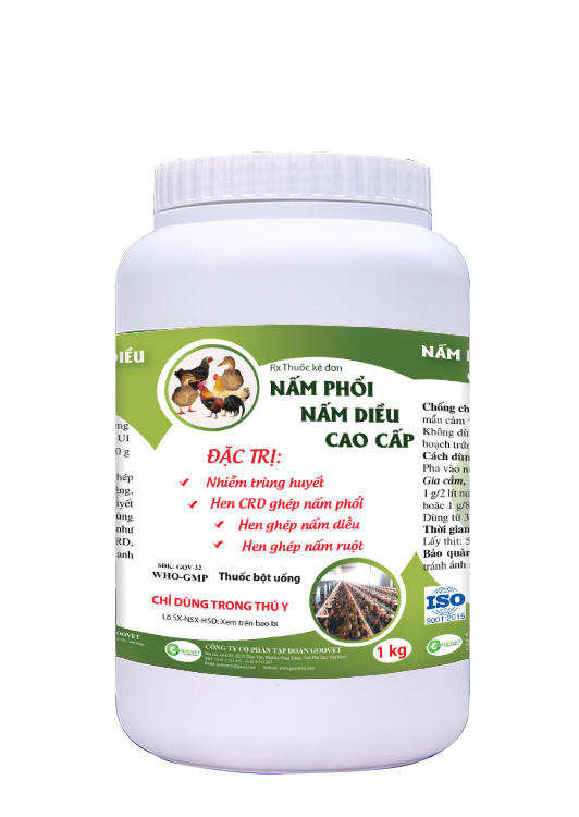 Đặc trị nấm phổi ghép hen, ghép E.coli, Salmonella, nấm miệng, nấm diều, nấm nội tạng, tụ huyết trùng, thương hàn, nhiễm trùng huyết, viêm đường hô hấp như viêm phổi, viêm phổi phế, CRD, viêm ruột tiêu chảy, phân xanh phân trắng.